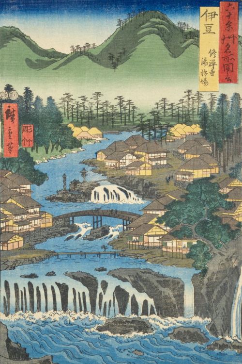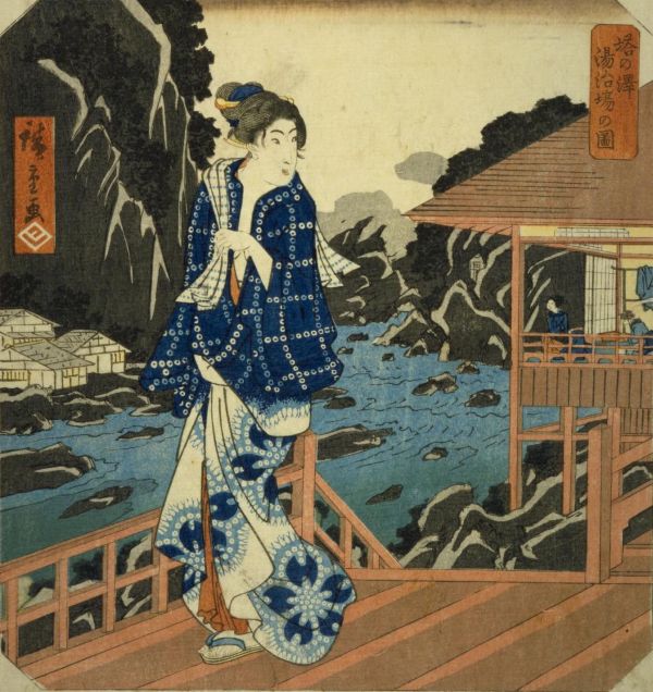 歌川広重『箱根七湯図会 塔の澤』 江戸時代、箱根などの温泉地は庶民の湯治場として賑わいました。早川沿いの風光明媚な景色の中で、人々は日頃の疲れを癒やし、心身のバランスを整える「養生」を実践した。